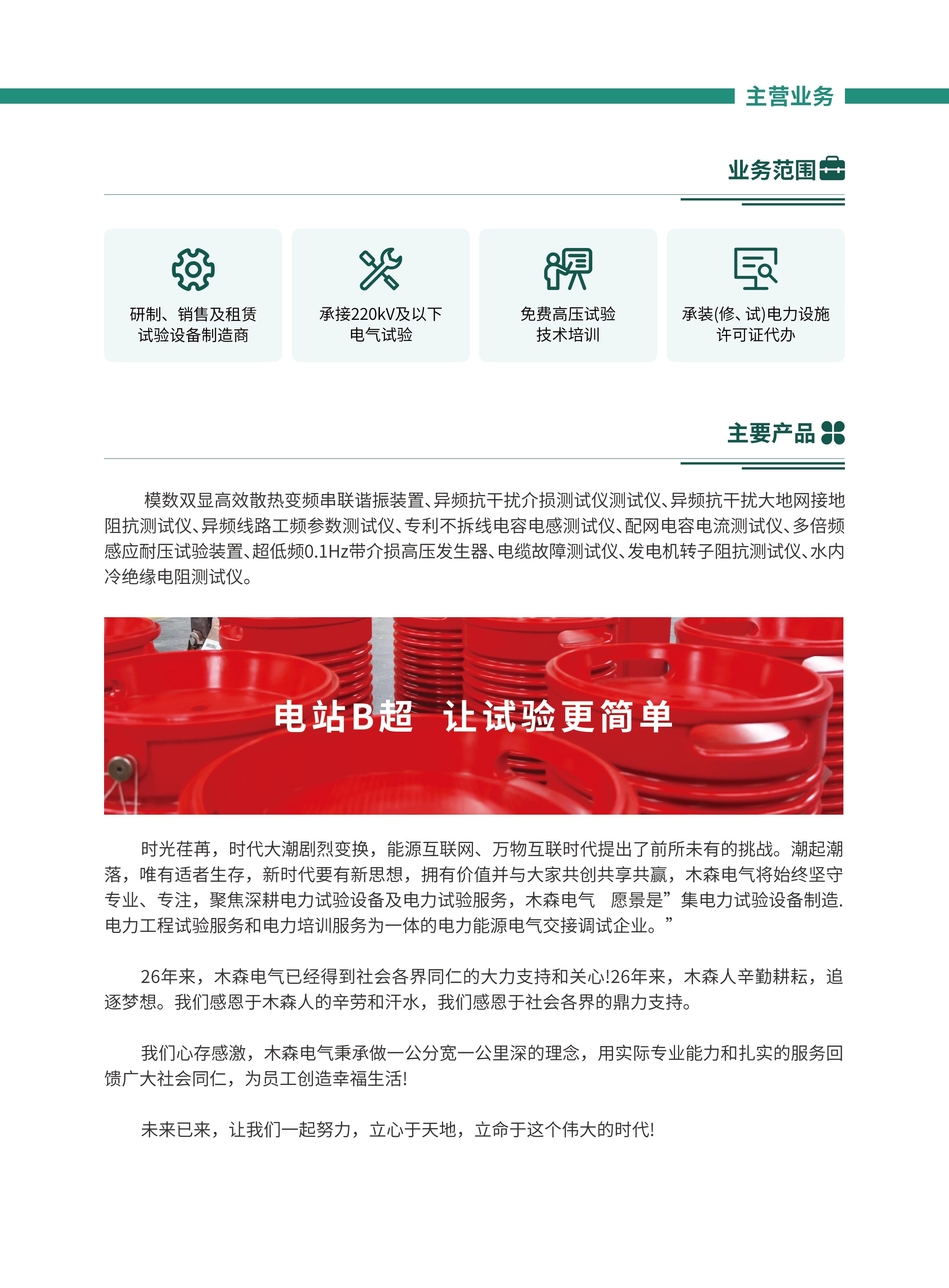 •     武漢市木森電氣有限公司成立于1996年 8月,是承裝(修、試)電力試驗設(shè)備生產(chǎn)廠家,,專業(yè)從事串聯(lián)諧振、無局放試驗變壓器、交直流高壓測試儀等變電站電力試驗測試設(shè)備和輸電線路檢測設(shè)備的研究開發(fā)、生產(chǎn)銷售和服務(wù)于一體高新技術(shù)企業(yè)。始終堅持“高品質(zhì) 好服務(wù) 講誠信 樹品牌”12字方針,專注電力試驗產(chǎn)品和電力試驗服務(wù),與近萬家企業(yè)成功合作。 武漢市木森電氣有限公司是湖北電力機電行業(yè)協(xié)會、湖北省電力企業(yè)服務(wù)協(xié)會、湖北電力計量測試協(xié)會的會員單位,是武漢電力職業(yè)技術(shù)學(xué)院實習(xí)研發(fā)基地、三峽電力職業(yè)技術(shù)學(xué)院實習(xí)基地、九三學(xué)社國網(wǎng)電力科學(xué)研究院高壓支社木森活動基地。